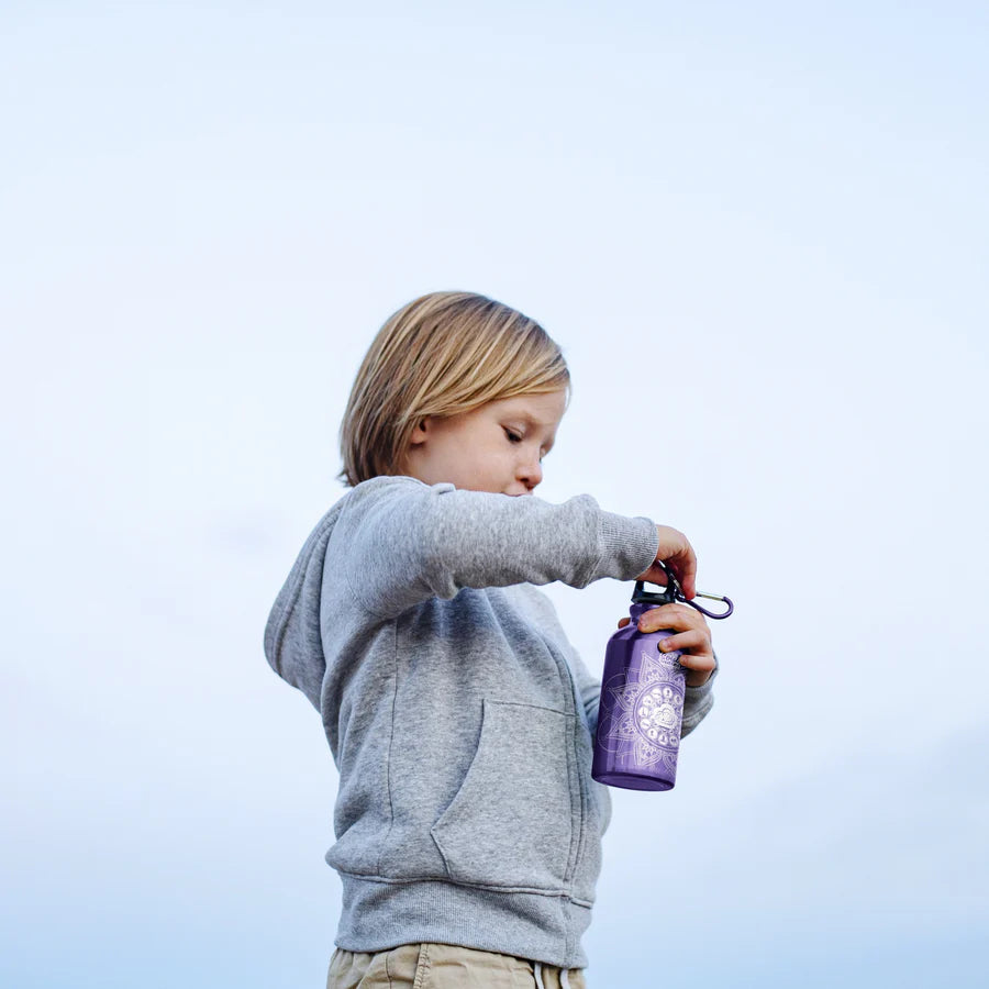 A lightweight child-sized aluminum reusable water bottle with a handy clip. The Cloud bottle is Purple with a selection of flying and balancing yoga poses printed on the bottle.